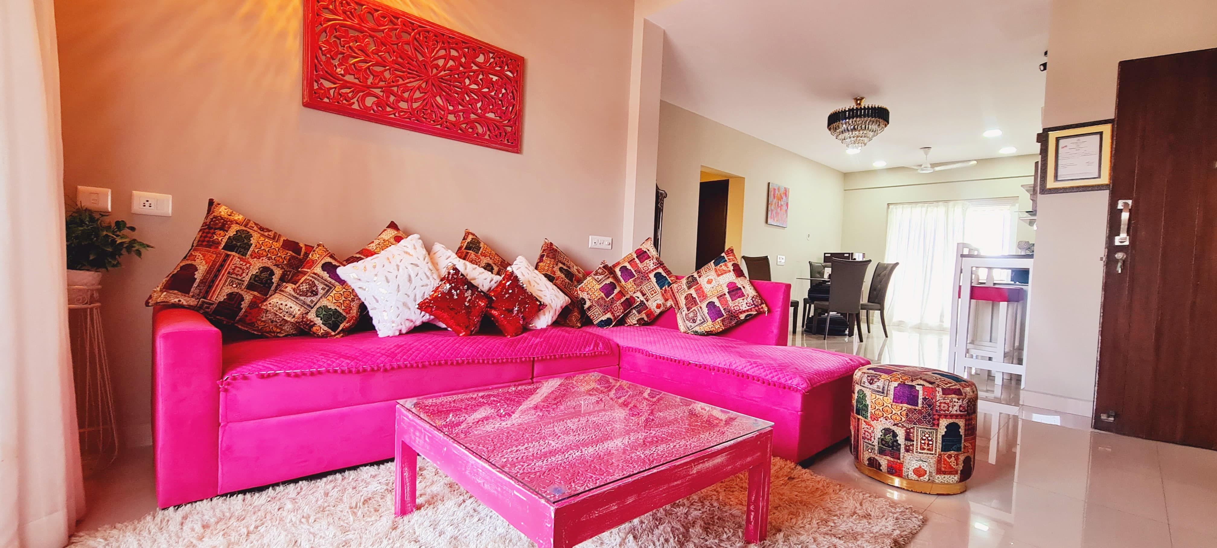This premium homestay features spacious and thoughtfully designed 2-bedroom apartments that provide a comfortable stay for up to five guests. The interiors are modern and elegant, offering well-furnished living spaces, air-conditioned bedrooms, stylish décor, and large windows that allow natural light to fill the rooms. Guests can enjoy a cozy living area with a Smart TV, comfortable seating, and a relaxing ambience that truly feels like a home away from home.